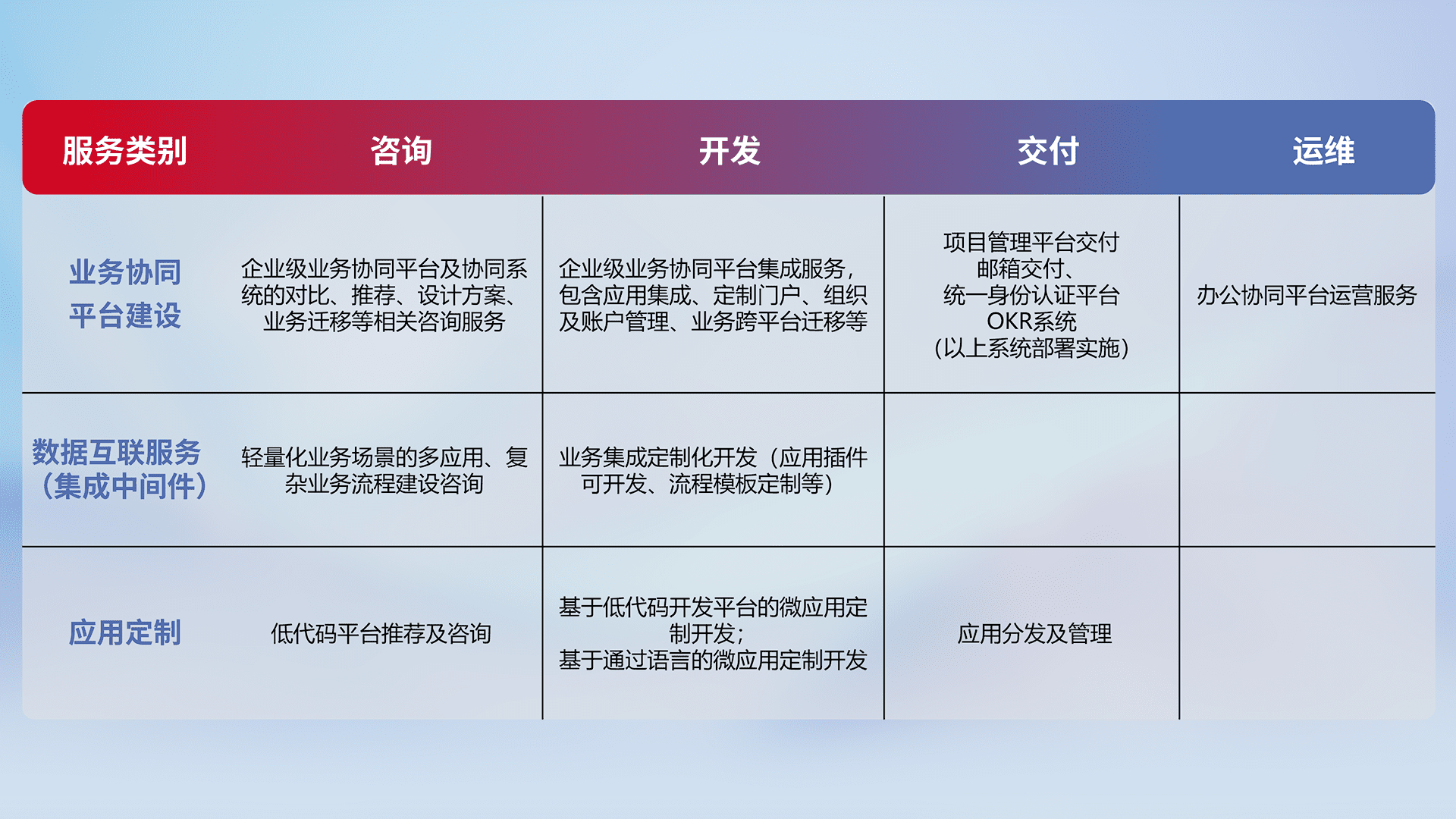 针对钉钉、、、企微、、、IDaas等平台级产品提供产品的规划、、方案、、、、交付、、、定制化开发等服务,,,,实现如统一协同办公、、智能客户服务、、、、混合会议管理、、、、智能数据查询、、、等业务场景,,实现数字化转型。。。。