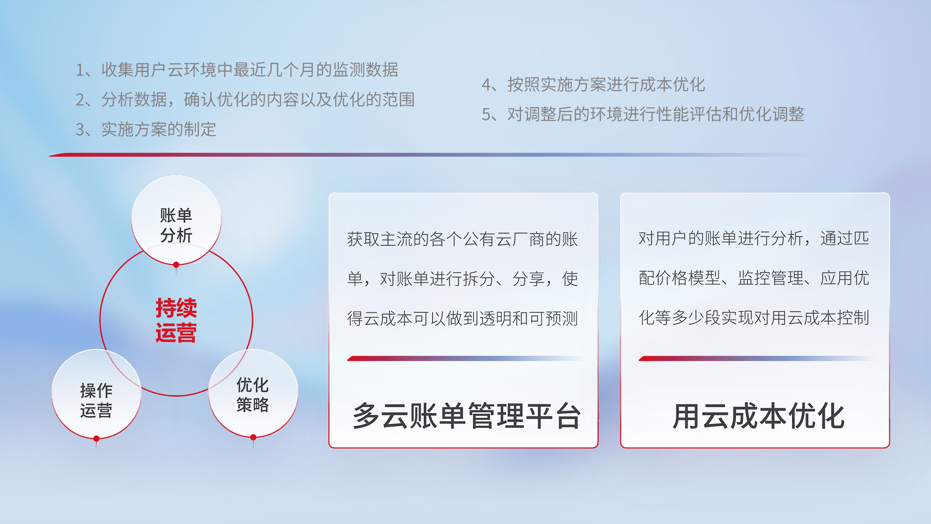 通过多云纳管,,以统一的资源数据模型把客户的云资源进行抽象和封装,,,,进而实现对多云资源的统一操作,,,保障云资源管理的可靠性、、稳定性与可用性。。量身定制化运维内容,,,配置、、开发运维、、、补丁管理、、、备份、、监控、、、、认证和访问管理、、审计和日常巡检等,,,,保障在用云过程中的可靠度,,稳定度以及高可用率。。